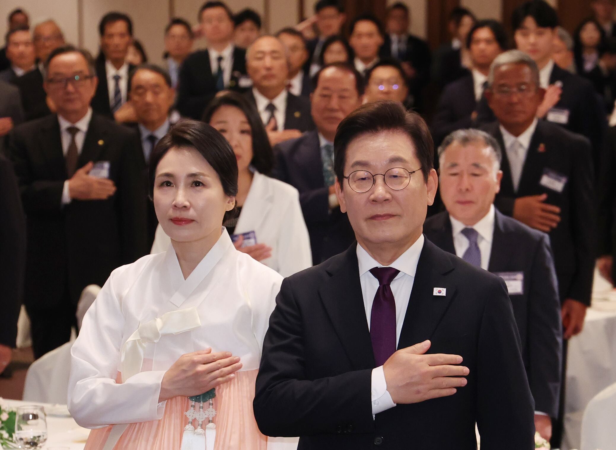 이재명 대통령과 김혜경 여사가 23일 일본 도쿄의 한 호텔에서 열린 재일동포 오찬 간담회에서 국기에 경례하고 있다. /연합뉴스 |