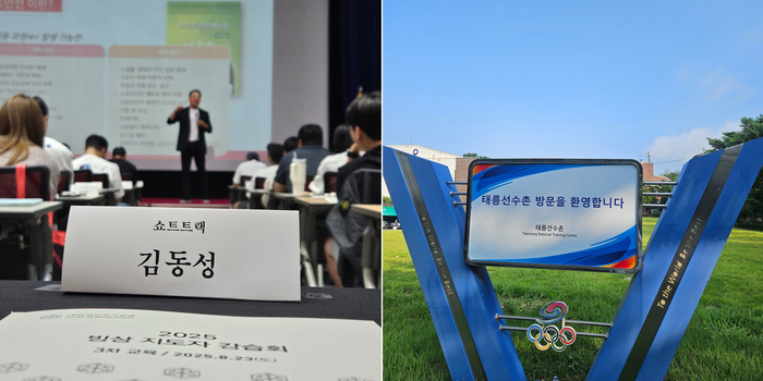 테이블 위에는 ‘쇼트트랙 김동성’이라고 적힌 명찰과 강습회 자료들이 놓여있고, 강단 앞에서는 강연이 진행 중이다.