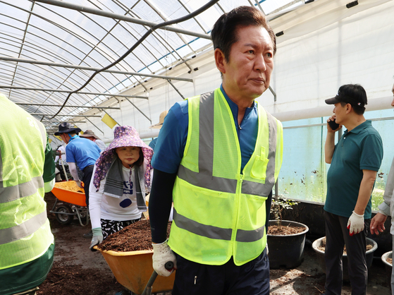 더불어민주당 정청래 당 대표 후보가 7월 22일 전남 나주시 다시면의 한 블루베리농장에서 수해 복구 작업하고 있다. 연합뉴스 |