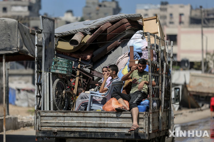 [ 신화/뉴시스] 8월 22일 가자지구의 가자시티 부근 도로에서 다시 피난길에 오른 팔레스타인 가족들. 이스라엘군은 인구가 많은 가자시티를 2주일째 포위하고 군대 진입 전에 대피를 권고했으며 23일엔 가자 북부 국경지대에서 팔레스타인TV의 촬영기자 한 명을 또 살해했다. 2025. 08.24. |