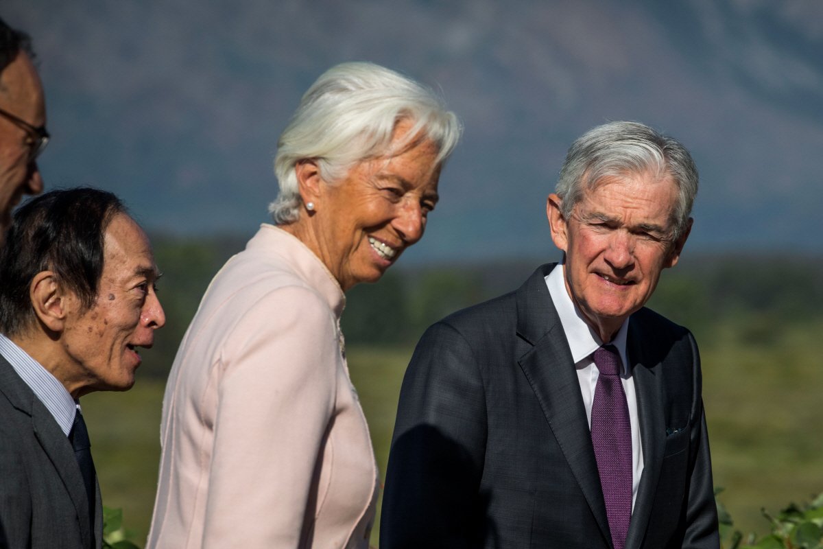 제롬 파월(오른쪽) 미국 연방준비제도(Fed·연준) 의장이 크리스틴 라가르드(가운데) 유럽중앙은행 총재, 우에다 가즈오 일본은행 총재와 대화하고 있다. |