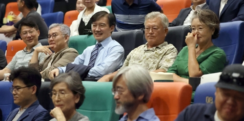 문재인 전 대통령 내외와 조국 조국혁신당 혁신정책연구위원장 등이 24일 오후 경남 양산시 물금읍 메가박스 양산증산점에서 영화 ‘다시 만날, 조국’ 관람을 앞두고 객석에 앉아 있다. 왼쪽 두 번째부터 최강욱 더불어민주당 교육연수원장, 조국 위원장, 문 전 대통령, 김정숙 여사. [연합뉴스] |
