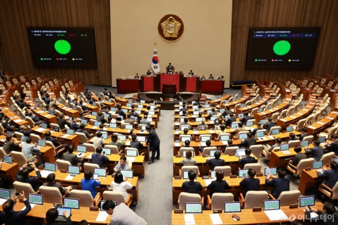 [서울=뉴시스] 김금보 기자 = 24일 오전 서울 여의도 국회에서 열린 제428회 국회(임시회) 제2차 본회의에서 노동조합 및 노동관계조정법 일부개정법률안(대안)이 더불어민주당 주도로 통과되고 있다. 2025.08.24. kgb@newsis.com /사진=김금보 |