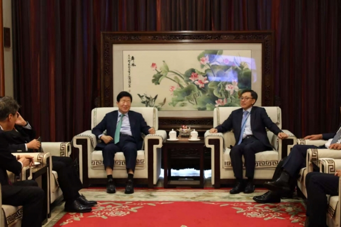 박병석 전 국회의장을 단장으로 하는 중국 특사단이 24일 오후 베이징 서우두공항에 도착했다. 공항에서 천샤오춘 외교부 부국장이 특사단을 영접했다./사진=주중한국대사관 제공 |