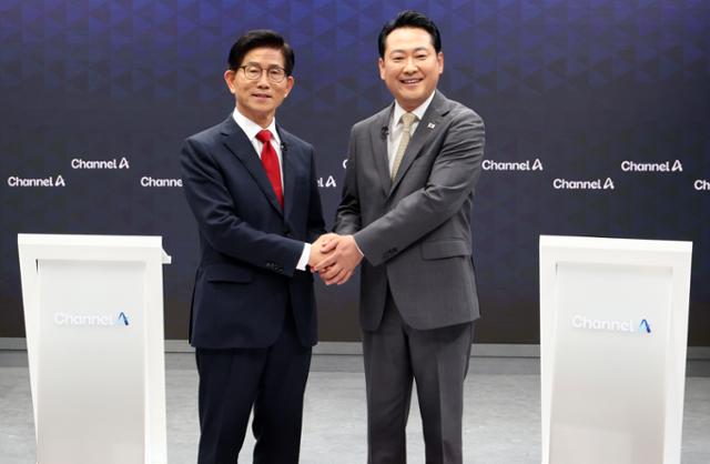 김문수-장동혁 채널A 방송토론 국민의힘 당대표 선거 결선에 진출한 김문수(왼쪽)·장동혁(가나다순) 후보가 23일 서울 채널A 광화문 스튜디오에서 결선 투표를 앞두고 방송토론회를 가졌다. 국회사진기자단 |