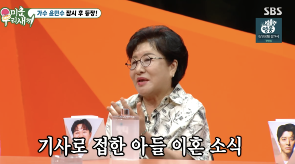 이날 윤민수 어머니는 "아들 이혼 소식을 알고 있었나"라는 신동엽의 질문에 "기사 보고 알았다. 아들 기사를 매일 들어가서 보는데 그러다가 알게 됐다"라고 답했다. 이어 윤민수 어머니는 "밖에 나가기가 싫더라. 사람 만나기가 싫더라. 요즘 세상 흉도 아니라고 이야기 해서 조금씩 나아지긴 했는데 그 전에는 밖에 나가기가 싫었다"라고 털어놓았다.