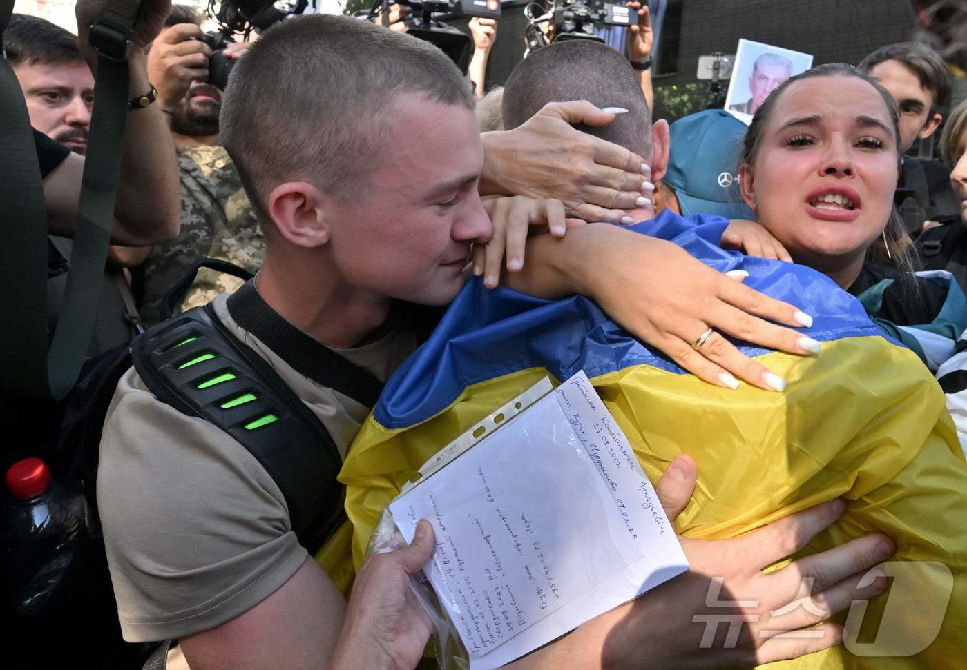 러시아에 포로로 잡혀 있다가 지난 14일 석방된 우크라이나인이 어깨에 우크라이나 국기를 두른 채로 체르니히우 지역에서 가족들과 포옹하고 있다. 2025.08.14 ⓒ AFP=뉴스1 ⓒ News1 강민경 기자 |