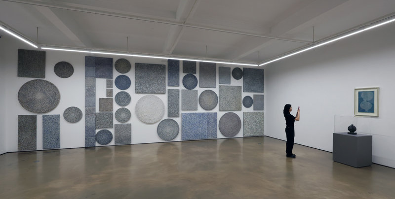같은 전시장 맞은편에는 백자 술병인 ‘표형문자입주병’이 전시됐다. 이 병 좌우로 김환기가 한글을 연상케 하는 문자를 그린 추상 ‘무제’(1960년대)와 작은 활자들을 모아서 제작한 이진용 작가의 ‘컨티뉴엄’ 연작이 벽면을 가득 채운다. 이렇게 전시는 흙으로 빚은 도자기에서 시작해 흙을 재료로 하거나 이것을 연상케 하는 회화, 설치 작품으로 확장된다.