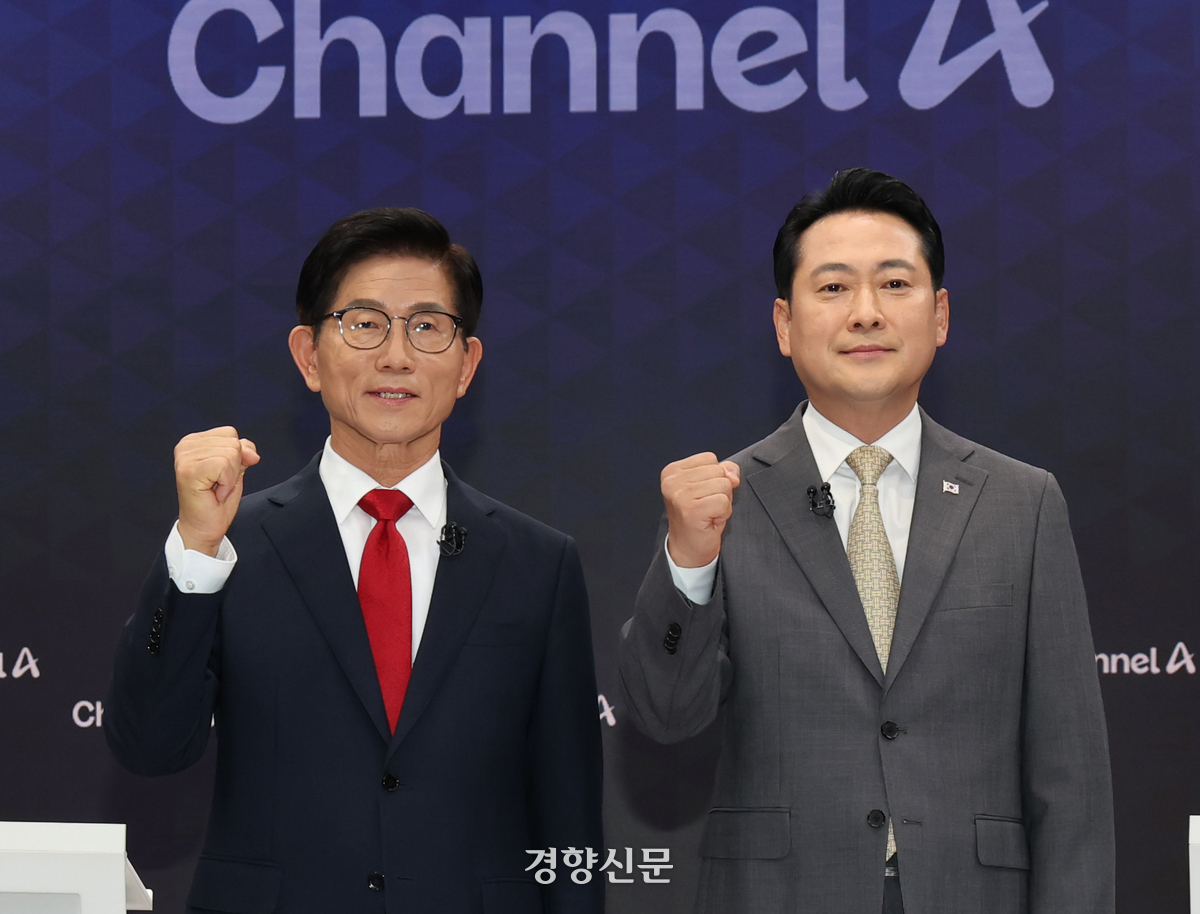 국민의힘 당대표 선거 결선에 진출한 김문수 전 고용노동부 장관(왼쪽)과 장동혁 의원이 지난 23일 서울 채널A 광화문 스튜디오에서 열린 방송 토론회에 앞서 사진 촬영을 하고 있다. 국회사진기자단 |