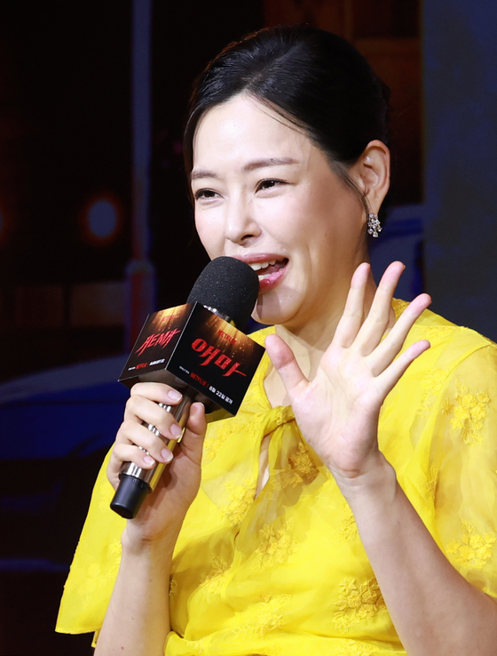 배우 이하늬가 18일 오전 서울 중구 호텔나루서울엠갤러리에서 열린 넷플릭스 시리즈 '애마' 제작발표회에 참석해 취재진 질문에 답하고 있다. 뉴스1 |