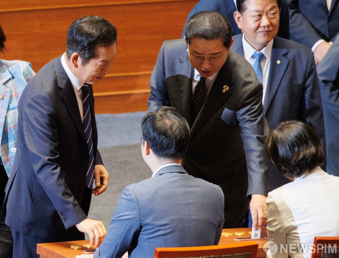 [서울=뉴스핌] 윤창빈 기자 = 정청래 더불어민주당 대표, 김병기 원내대표가 25일 오전 서울 여의도 국회에서 열린 본회의에서 상법 일부개정법률안에 대한 무제한 토론 종결의 건에 대한 투표를 하고 있다. 2025.08.25 pangbin@newspim.com
