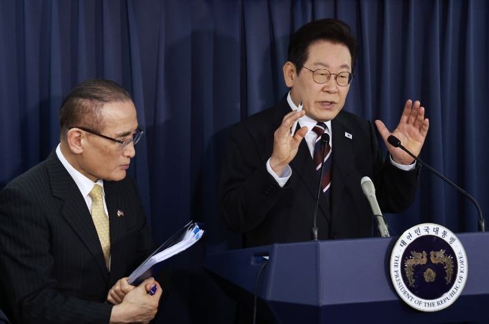 이재명 대통령이 24일(현지시간) 일본 도쿄 하네다공항 이륙 뒤 한미 정상회담을 위해 미국 워싱턴DC로 향하는 공군 1호기 기내에서 기자간담회를 하며 취재진의 질문에 답하고 있다. 이 대통령 왼쪽은 위성락 국가안보실장. 연합뉴스 |