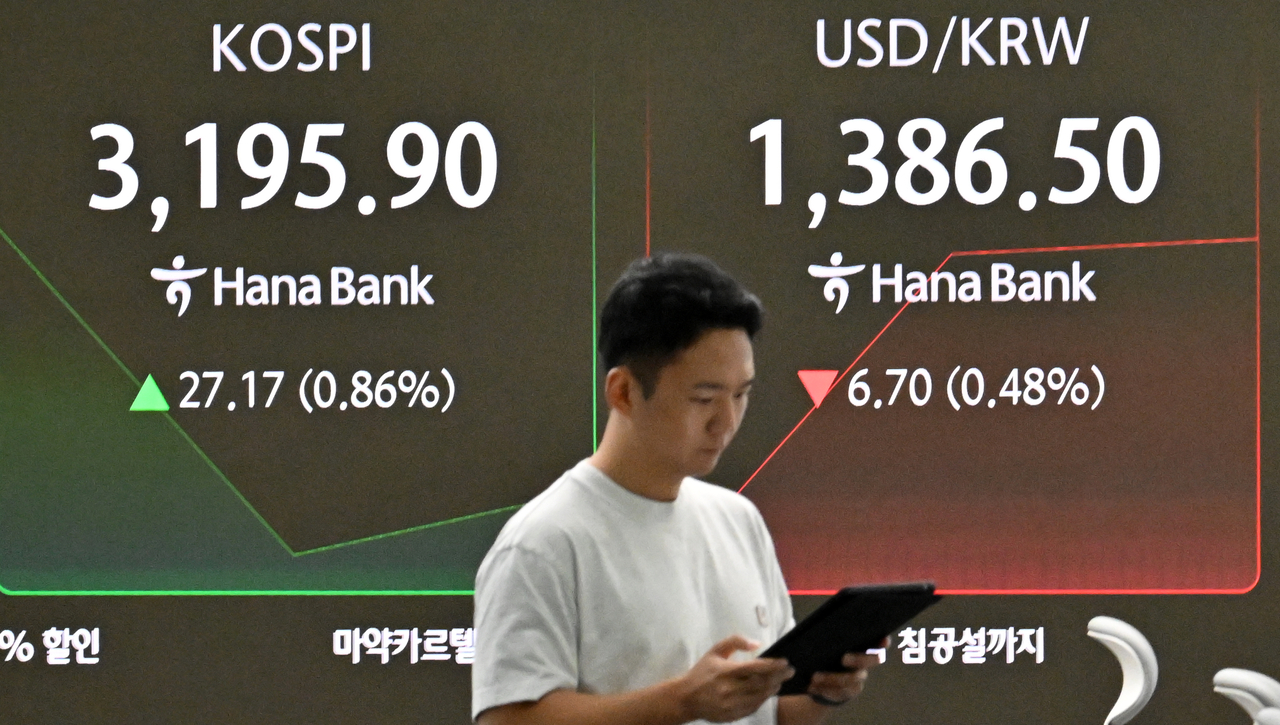 코스피가 25일 상승 출발했다. 지난주 열린 잭슨홀 미팅에서 제롬 파월 연방준비제도 의장의 발언을 통해 미국의 기준 금리 인하 기대감이 높아진 영향으로 풀이된다. 오전 서울 중구 하나은행 딜링룸 전광판에 코스피 지수가 오전 9시 10분 기준 전 거래일보다 27.17포인트 상승한 3195.90포인트를 나타내고 있다. 원·달러 환율은 1386.50원이다. 임세준 기자 |