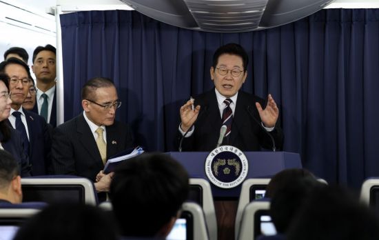 이 대통령은 일본 하네다 공항을 떠나 미국 워싱턴D.C.로 향하는 전용기에서 깜짝 기내 간담회를 갖고 주요 현안에 관한 견해를 전했다. 이 대통령은 쟁점 사안인 관세 협상 진행 상황과 관련해 "최종적으로는 현실적이고도 합리적인 결론에 이르게 될 것"이라고 말했다. 이 대통령은 "다만 그 과정이 매우 힘들다. 그렇더라도 힘든 줄 알면 미리 대비할 수 있으니 최선을 다해보겠다"고 했다.