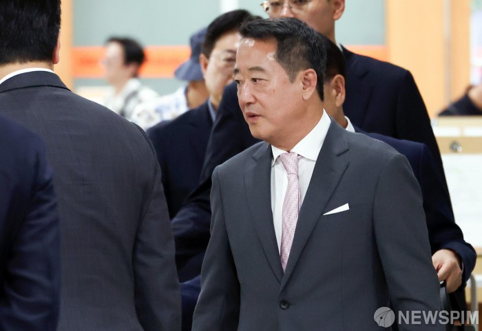 [서울=뉴스핌] 최지환 기자 = 골관절염 세포유전자치료제 인보사 성분 조작 의혹을 받는 이웅열 코오롱그룹 명예회장이 25일 오후 서울 서초구 서울고등법원에서 열린 항소심 2차 공판에 출석하고 있다. 2025.08.25 choipix16@newspim.com