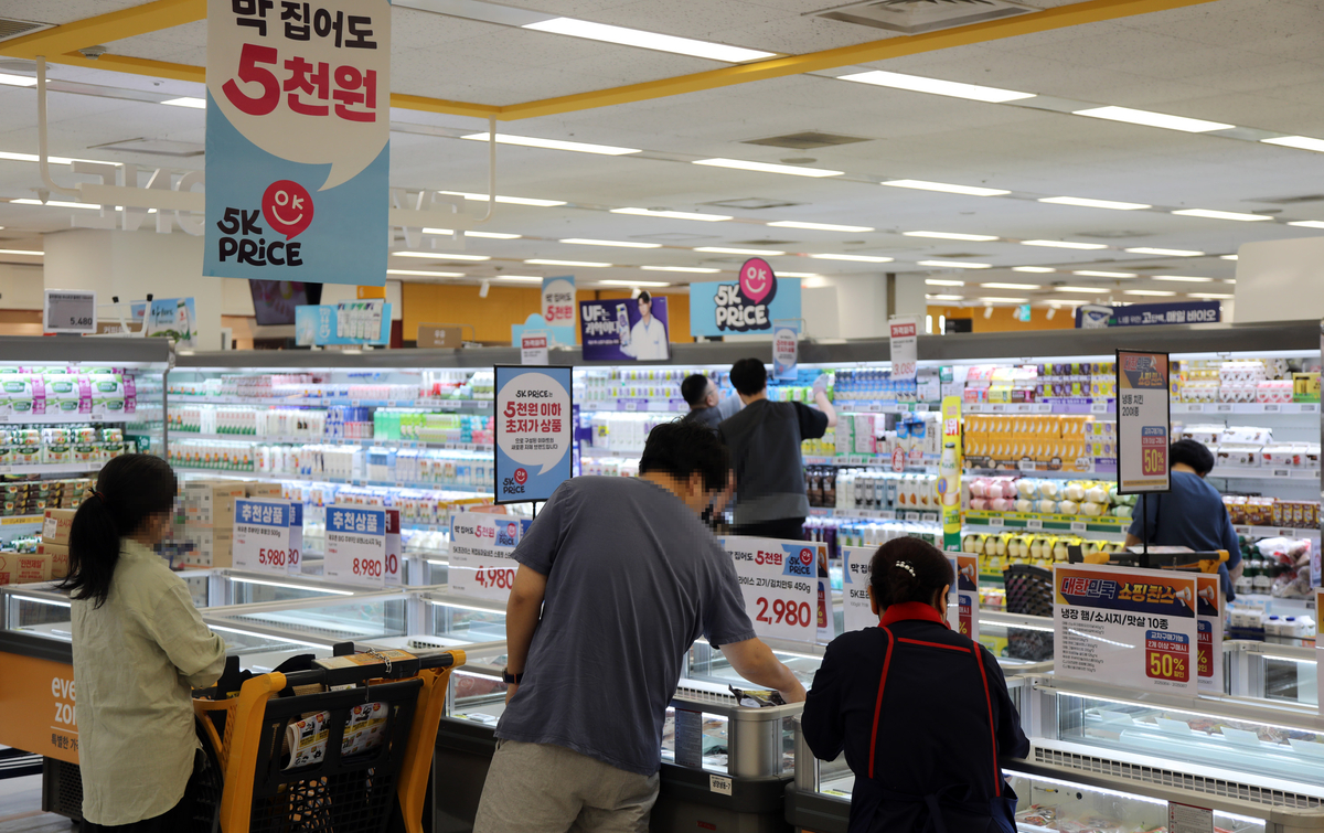 이마트 자체 브랜드 ‘5K PRICE’(오케이 프라이스)이 출시된 지 4일 만인 18일 소비자들이 서울 용산 이마트에서 장을 보고 있다. 이마트 제공 |