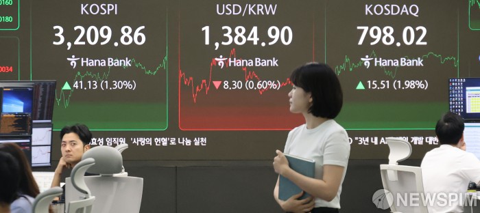 [서울=뉴스핌] 양윤모 기자 = 미 연준의 금리인하 가능성이 높아진 가운데, 25일 오후 코스피가 전장 종가보다 41.13포인트(1.30%) 상승하며 3209.86 으로, 코스닥은15.51포인트(1.98%) 상승한 798.02로 마감한 가운데, 서울 중구 하나은행 딜링룸에서 직원들이 업무를 보고 있다. 서울외환시장에서 원·달러 환율은 전장 대비 8.30원 하락한 1384.90원에 거래를 마감했다. 2025.08.25 yym58@newspim.com