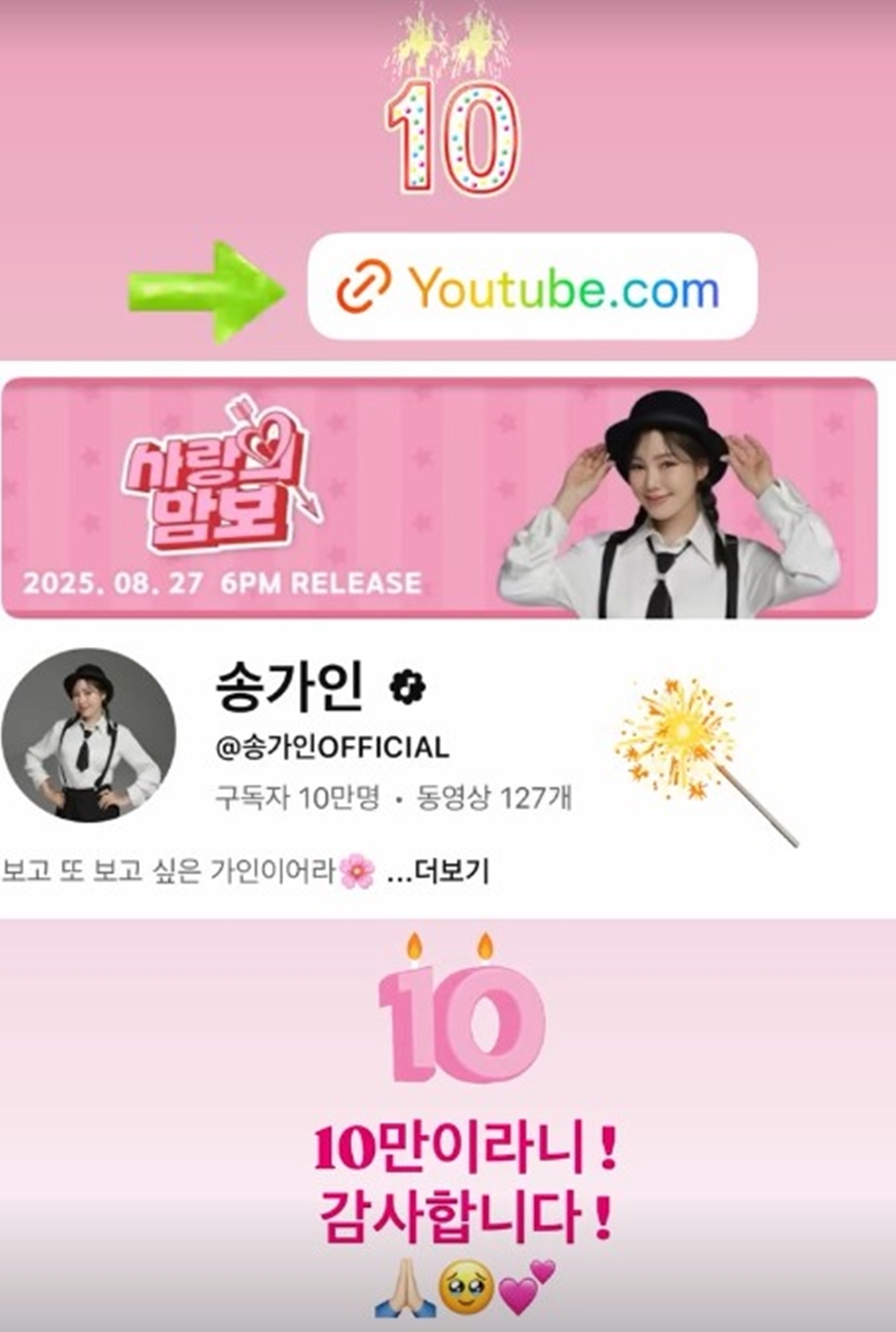 송가인은 25일 오후 공식 SNS 채널을 통해 유튜브 채널 ‘송가인’의 구독자 10만명 돌파 소식을 알리면서, “10만이라니. 감사하다”라고 소감을 밝혔다.