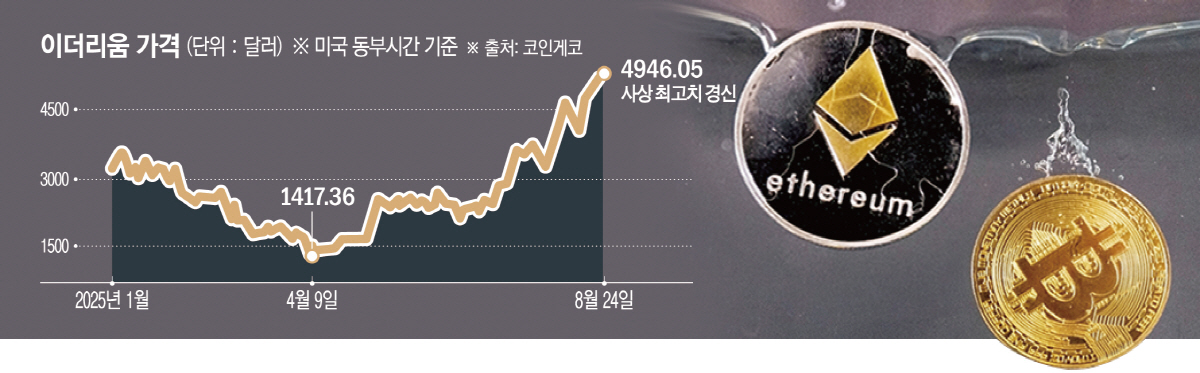 24일(현지시간) 가상자산 정보 제공업체인 코인게코에 따르면 이더리움 가격은 사상 처음으로 4900달러(약 680만 원)를 돌파하며 약 4년 만에 역대 최고가 기록을 새로 썼다. 이더리움 가격은 이날 4946.05달러까지 고점을 높였다. 이전 최고가는 2021년 11월의 4878달러였다.