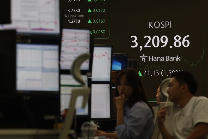 25일 중구 하나은행 본점 딜링룸 전광판에 코스피가 표시돼 있다. 이날 코스피는 41.13p(1.30%) 오른 3,209.86에 장을 마쳤다. 사진=연합뉴스 |