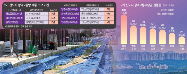3기 신도시는 ‘선교통 후입주’를 내걸었지만 상황은 별반 다르지 않다. 고양창릉지구를 지나는 고양은평선은 개통 목표 시점이 2029년에서 2031년으로 연기됐다. GTX-A 창릉역은 설계 변경을 거치고 추가 공사 기간 등의 이유로 당초 2026년 목표에서 2030년까지 개통이 미뤄진 상황이다. 하남 교산지구는 송파구와 하남 교산지구를 잇는 지하철 3호선 연장선 '송파하남선' 개통이 2년 연기됐다. 당초 2025년 착공, 2030년 개통을 목표로 했지만 2년씩 지연됐다. 남양주 왕숙은 GTX-B 노선과 지하철 9호선 '강동하남남양주선'이 지날 예정이다. 다만 GTX-B는 지난해 착공식을 진행했지만 수익성 등에 따른 이유로 민간 구간은 실착공이 지연됐다. 당초 개통 시점이 2030년이었지만 공사기간을 고려하면 2031년 개통이 가능할 것으로 예상된다. 부담금을 늘려 실탄을 확보했지만 사업 진행 속도는 2기 신도시에 비해 전혀 개선되지 않았다는 비판이 나온다. 3기 신도시 5곳의 광역교통부담금은 9조 7815억 원에 달한다. 가구당 부담금은 2기 신도시의 두 배 수준인 가구당 3000만 원~4000만 원으로, 분양가에 포함될 것이라는 전망된다.