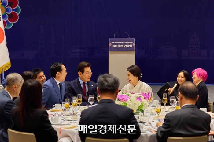 이재명 대통령과 김혜경 여사가 24일(현지시간) 미국 워싱턴DC의 한 호텔에서 열린 동포 만찬 간담회에 참석했다. [워싱턴=김호영 기자]2025.08.25 |