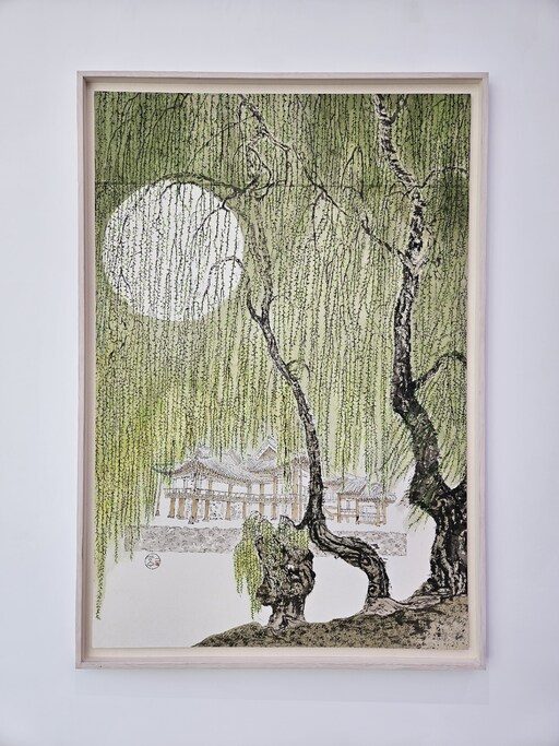 특히 ‘유류’는 작가가 2024년부터 준비해온 버드나무 연작시리즈다. 그의 작품에 자주 등장하는 만월과 함께 생명력 넘치는 능수버들의 가지가 화면 전체에 일렁인다. 동양화의 붓은 섬세하다. 서양화의 붓과 다르다. ‘살아 있음’이 단번에 팍 느껴지는 그림이 완성되는 이유다.