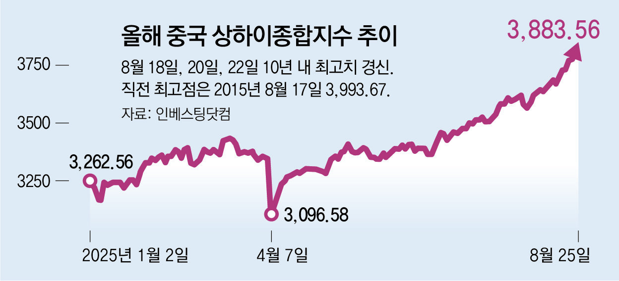 최근 중국 증시 강세는 정부 주도로 유동성이 커진 영향이다. 중국 정부가 부동산 대출 규제에 나서자 2022년부터 투자자들은 안정적인 예금을 늘려 왔으나 최근 예금 금리가 1% 아래로 떨어지고, 채권 수익률도 1%대 중반에 머물면서 주식 투자 수요가 커졌다. 백은비 유진투자증권 연구원은 “하루 거래대금이 2조 위안을 넘기는 등 개인과 기관의 유동성이 유입되며 중국 증시가 10년 만에 최고치를 기록했다”며 “완만한 강세장으로 진입할 것이란 기대감도 형성되고 있다”고 설명했다.