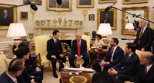 이재명 대통령과 도널드 트럼프 미국 대통령이 25일(현지시간) 미국 워싱턴DC 백악관에서 정상회담을 하고 있다. [사진=연합뉴스] |