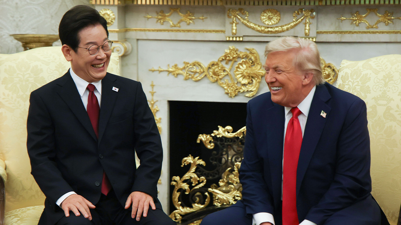 ▲ 이재명 대통령이 25일(현지 시간) 미국 워싱턴DC 백악관 오벌오피스에서 도널드 트럼프 미국 대통령과 한미 정상회담을 하며 함께 웃고 있다.