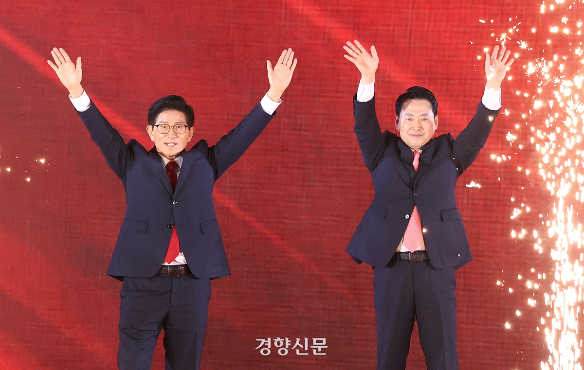 김문수·장동혁 국민의힘 당대표 후보가 지난 22일 충북 청주시 오스코에서 열린 국민의힘 전당대회에서 결선 진출에 성공한 뒤 손을 들어 인사하고 있다. 권도현 기자 |