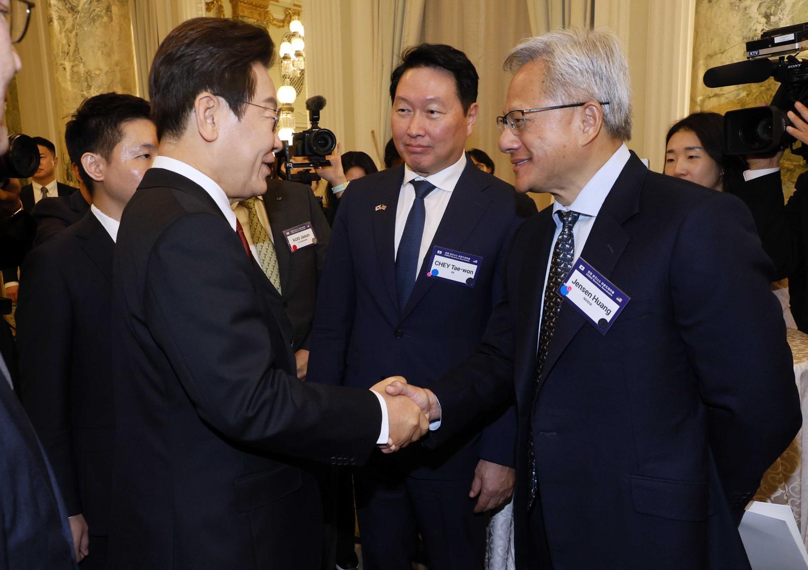 이재명 대통령이 25일(현지시간) 미국 워싱턴DC 윌라드 호텔에서 열린 한미 비즈니스 라운드 테이블에 입장하며 젠슨황 엔비디아 CEO와 인사하고 있다. 2025.08.25 대통령실사진기자단 |