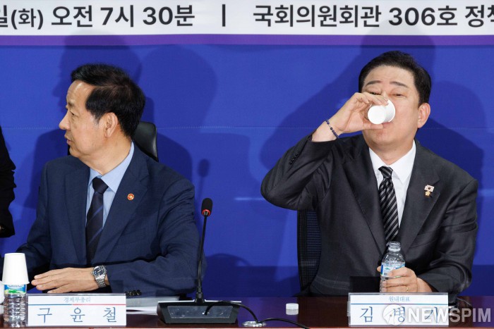 [서울=뉴스핌] 윤창빈 기자 = 김병기 더불어민주당 원내대표가 26일 오전 서울 여의도 국회 의원회관에서 열린 2026년 예산안 당정협의에서 물을 마시고 있다. 왼쪽은 구윤철 부총리 겸 기획재정부 장관. 2025.08.26 pangbin@newspim.com |