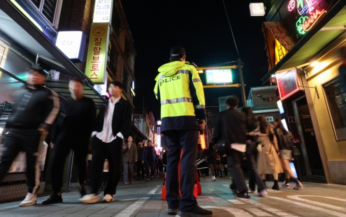 핼러윈데이인 지난해 10월31일 서울 용산구 이태원 일대에서 경찰관이 인파 관리를 위해 현장을 지키고 있다./사진=뉴스1. |