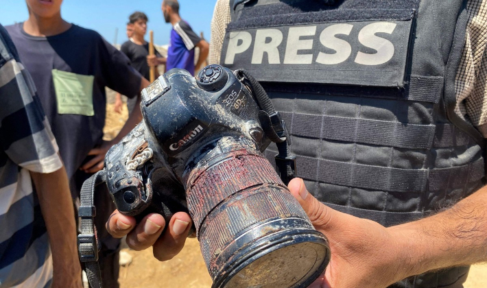25일(현지시간) 가자지구 남부 칸유니스의 나세르병원에서 이스라엘군 공습에 숨진 호삼 알마스리 기자의 카메라가 붉은 피를 뒤집어쓴 모습. 연합뉴스 |