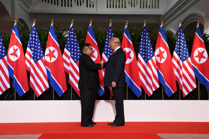 도널드 트럼프(오른쪽) 미국 대통령이 2018년 6월 12일 싱가포르 센토사 섬 카펠라 호텔에서 열린 북미 정상회담에서 김정은 북한 국무위원장과 악수하고 있다. (사진=AFP) |