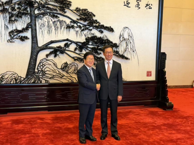 이날 박병석 전 국회의장(특사단 단장)과 더불어민주당 김태년·박정 의원, 노재헌 동아시아문화재단 이사장으로 구성된 특사단은 베이징 인민대회당에서 중국 권력서열 5위인 한 부주석을 만났다. 중국 측에선 한 부주석을 비롯, 쑨웨이둥 외교부 부부장과 천샤오춘 외교부 아주사(아시아국) 부사장(부국장), 린룽빈 중앙외사판공실 연구실 국장이 접견에 참석했다.