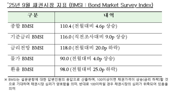 금융투자협회가 26일 발표한 '2025년 9월 채권시장지표'에 따르면 채권시장 심리를 나타내는 종합 채권시장지표(BMSI)는 110.4로 전월(105.8) 대비 4.6포인트 상승했다. 채권 금리 및 달러/원 환율 상승 전망이 강화됐지만, 미국 기준금리 인하 가능성과 국내 주식시장 투자심리 약화가 반영되며 채권시장 심리는 전월보다 호전된 것으로 나타났다.