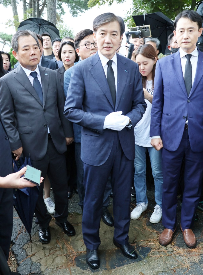 [광주=뉴스핌] 박진형 기자 = 조국 조국혁신당 혁신정책연구원장이 26일 광주 북구 운정동 국립 5.18 민주묘지를 방문해 전두환 비석을 밟고 있다. 2025.08.26 bless4ya@newspim.com
