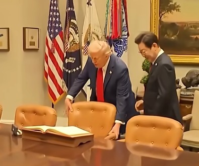 이날 이 대통령은 한미 정상회담을 위해 찾은 워싱턴DC 백악관에서 트럼프 대통령의 안내로 별도로 마련된 장소로 이동해 방명록에 서명했다. 트럼프 대통령은 이 대통령이 방명록 앞에 앉기 편하도록 직접 의자를 빼주는 매너를 보였다.