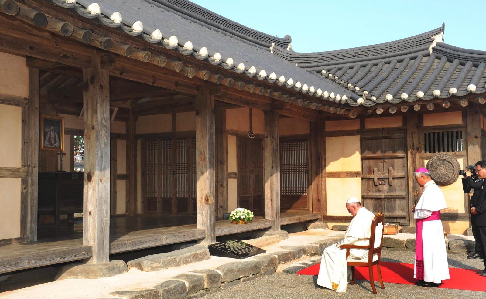 2014년 8월 15일 방한한 고 프란치스코 교황이 솔뫼성지 내 성 김대건 신부 생가 앞에서 기도를 드리고 있다. 뒤에 서있는 사람은 당시 대전교구장인 유흥식 추기경이다. 동아일보 DB |