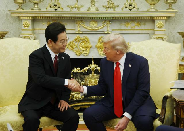 이재명 대통령과 도널드 트럼프 미국 대통령이 25일(현지시간) 미국 워싱턴DC 백악관에서 정상회담을 하며 악수하고 있다. [사진=연합뉴스] |