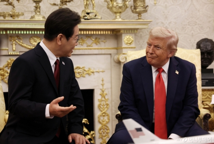 [워싱턴=뉴시스] 고범준 기자 = 이재명 대통령과 도널드 트럼프 미국 대통령이 25일(현지 시간) 미국 워싱턴DC 백악관에서 한미 정상회담을 하고 있다. 2025.08.26. |