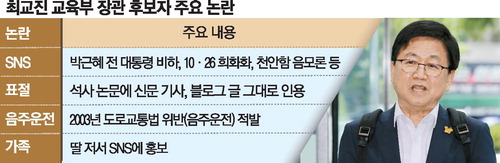 26일 교육계에 따르면 최 후보자는 그동안 SNS에 올린 정치색 짙은 발언으로 인해 논란을 겪고 있다. 최 후보자는 전국교직원노동조합 교사 출신이다. 천안함 사건을 두고는 '천안함 폭침 이유는 이스라엘 잠수함, 신상철 대표 법정 자료 제출'이라는 글을 공유하며 잠수함 충돌설 등 음모론에 공감을 표했다. 박근혜 전 대통령 퇴진 요구 집회에 참석해 찍은 사진과 함께 "잘 가라 병신년"이라는 글을 올려 장애인과 여성을 낮춰 부르기도 했고, 박정희 전 대통령이 서거한 10·26을 '탕탕절'이라고 부르며 공직자에 걸맞지 않은 과도한 표현이라는 비판을 받고 있다.