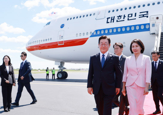 이재명 대통령과 김혜경 여사가 26일(현지시간) 미국 펜실베이니아주 필라델피아국제공항에 도착한 뒤 공군 1호기에 내려 공항을 빠져나가고 있다. (사진=연합뉴스) |