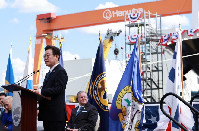 이 대통령은 이날 미국 필라델피아에 있는 ‘한화 필리조선소’를 방문해 미국 해양청이 발주한 국가안보다목적선(NSMV) ‘스테이트 오브 메인’호의 명명식에 참석해 이같이 연설했다.