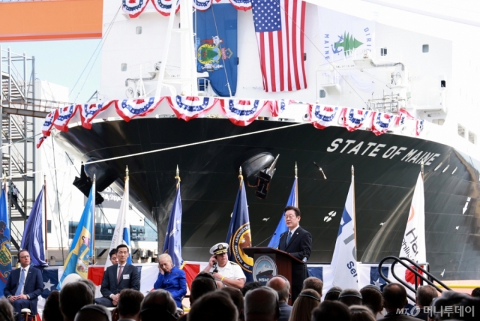 이어 "희망의 새 나라를 건설하겠다던 우리 국민의 강력한 의지가 강철에 스며들고 파도에 실려 '조선업 강국 대한민국'이라는 신화를 만들어냈다"며 "그렇게 탄생한 대한민국의 조선업이 이제 미국의 해양 안보를 강화하고 미국 조선업 부활에 기여하는 새로운 도전의 길에 나서게 된다. 동맹국의 대통령으로서 대단히 기쁘게 생각한다"고 했다.