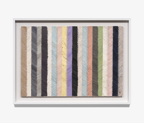 (서울=연합뉴스) 박의래 기자 = 은은한 색감으로 염색된 한지(韓紙)를 길게 자르고, 가장자리를 불로 태운 뒤 조각들을 층층이 겹치게 지그재그로 쌓아 올린다. 서로 다른 색의 한지가 만나는 경계는 틈으로 보이지만 개별적인 요소를 꿰매 결합한 것으로 보이기도 한다.