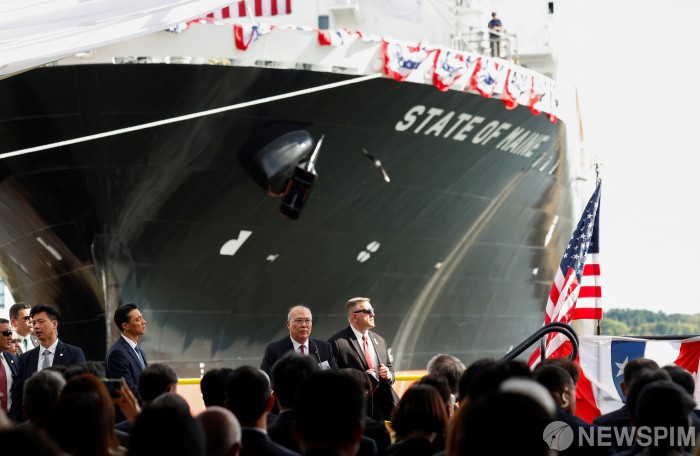 [펜실베이니아 로이터=뉴스핌] 데이비드 김 한화 필리조선소 대표가 26일(현지시간) 미국 펜실베이니아주 필라델피아에 위치한 한화 필리 조선소에서 열린 '스테이트 오브 메인'호 명명식에서 발언을 하고 있다. 2025.08.27 photo@newspim.com