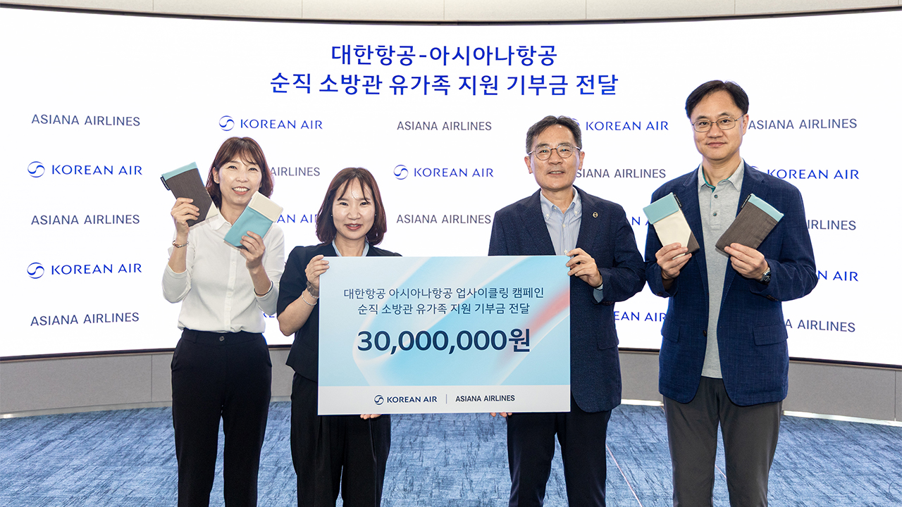 대한항공이 아시아나항공과 함께 업사이클링, 이른바 새활용 보조배터리 파우치를 제작하고 판매 수익금을 포함한 기부금을 사단법인 소방가족희망나눔에 전달했습니다.